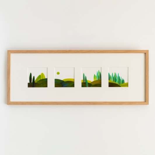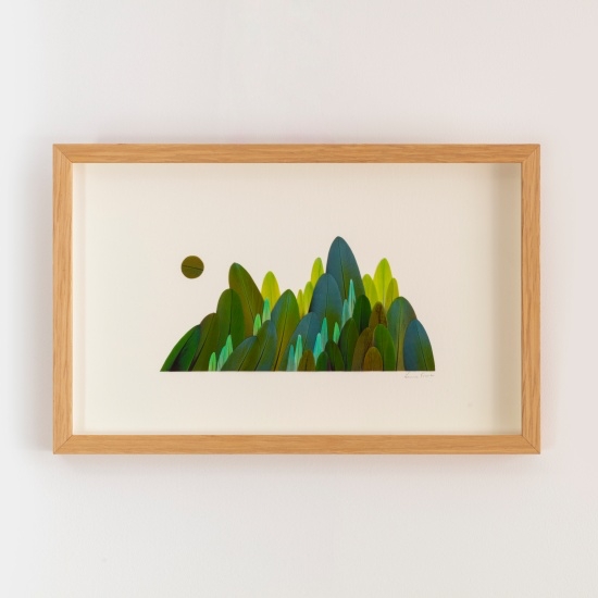 « Paysage », 2025, mosaïque de plumes, 28x18cm.